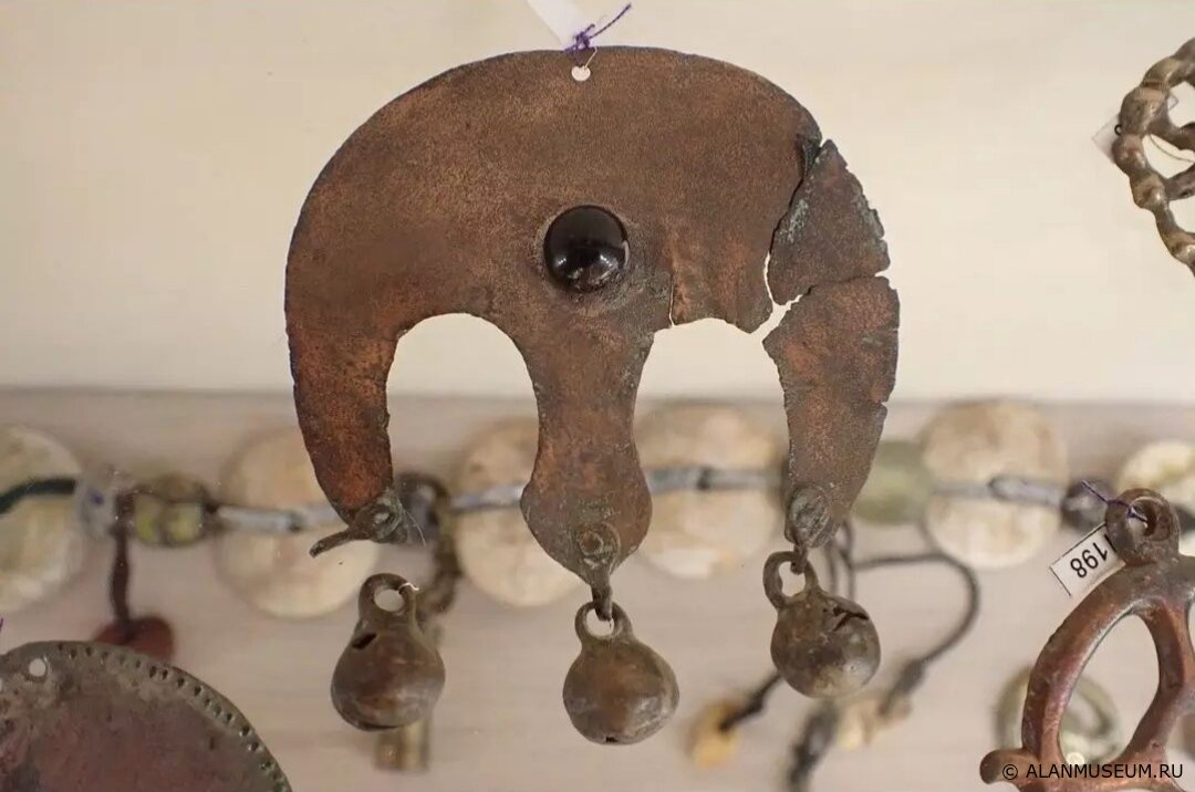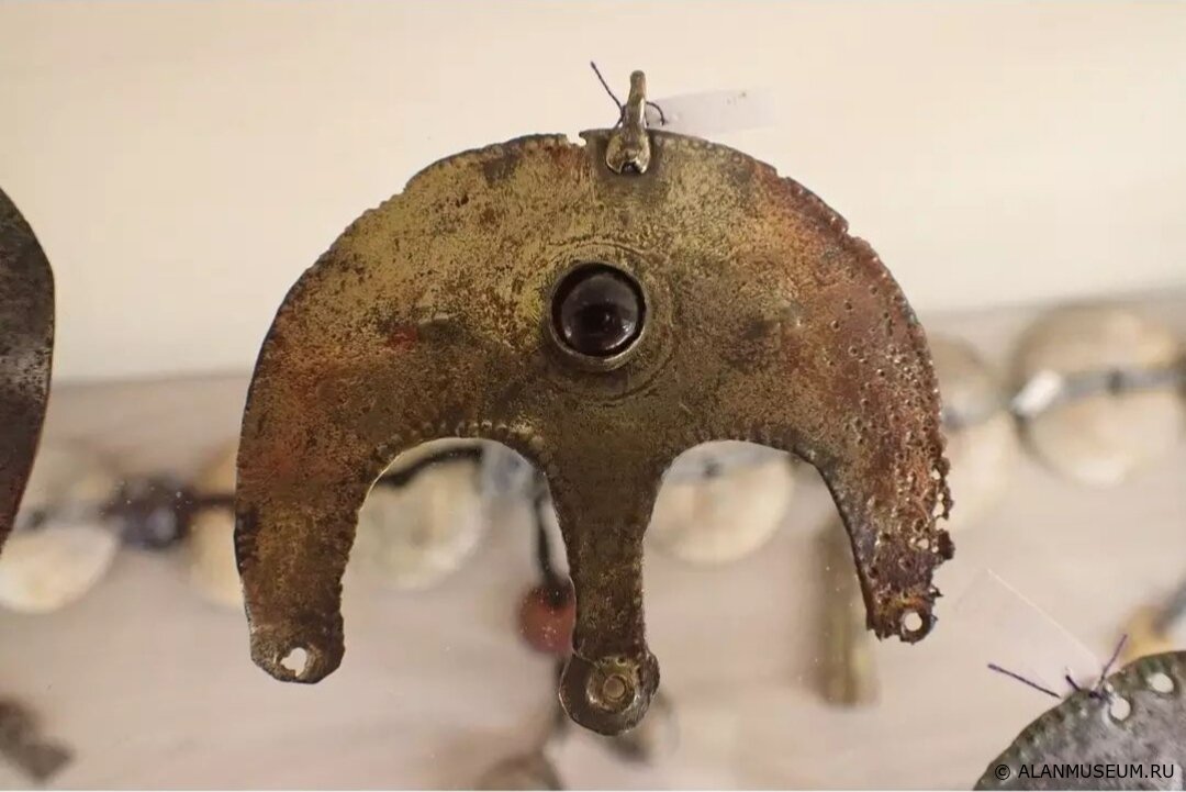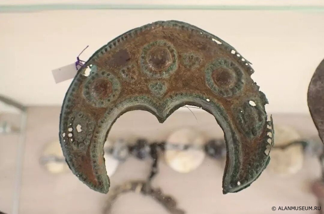 ✔️Довольно распространенной находкой в аланских захоронениях языческого типа являются лунницы — бронзовые или шелковые украшения в форме полумесяца, которые пришивались к одежде или прикреплялись на разные части костюма.